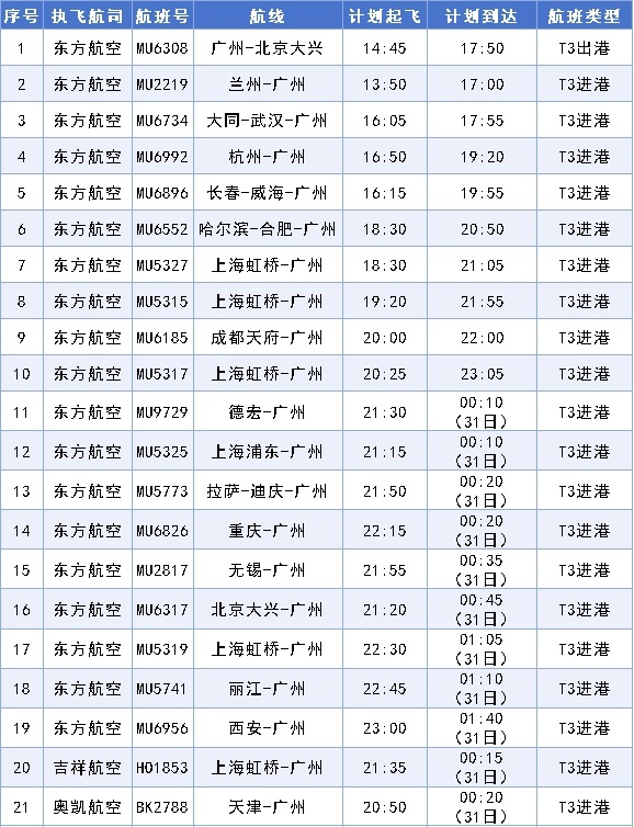 10月31日起,东方航空、上海航空、中国联合航空、吉祥航空、奥凯航空的国内进出港航班均调整至白云机场T3航站楼运营,东方航空的国际航班暂保留在T1航站楼运营。