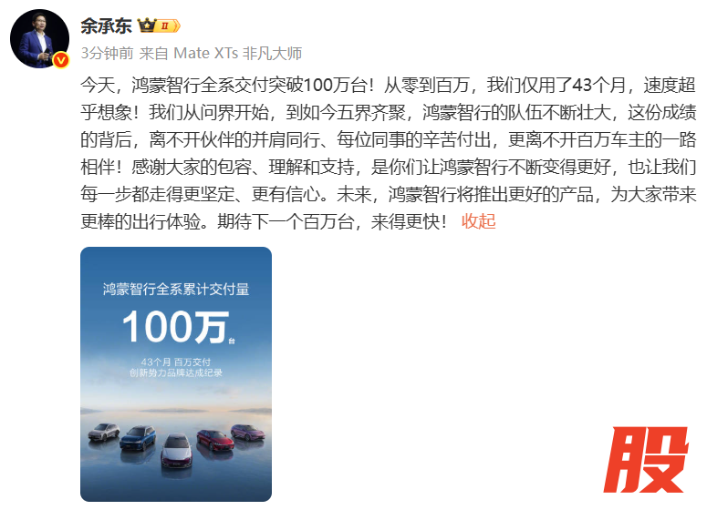 余承东:鸿蒙智行全系交付突破100万台余承东:鸿蒙智行全系交付突破100万台